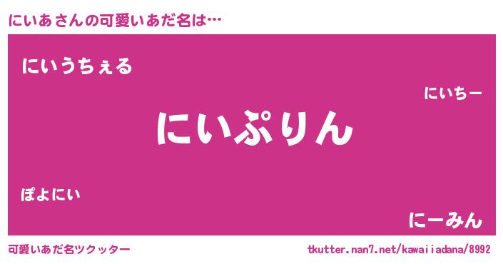 | 女子向けラノベタイトル風あだ名 | 『にいあの玉の輿計画!』 |