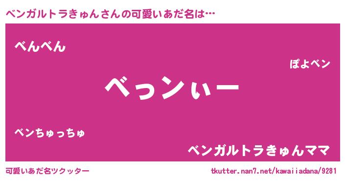 | 男性向けラノベタイトル風あだ名 | 『ベンガルトラきゅんの嫁は女の子じゃないと思った?』 |