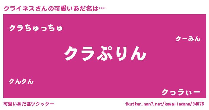 | 男性向けラノベタイトル風あだ名 | 『クライネス~年齢イコール彼女いない歴の魔法使い~』 |