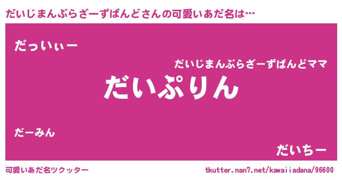 | 男性向けラノベタイトル風あだ名 | 『だいじまんぶらざーずばんど~年齢イコール彼女いない歴の魔法使い~』 |