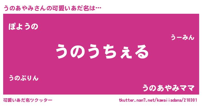 | 男性向けラノベタイトル風あだ名 | 『Re:うのあやみから始める異世界生活』 |