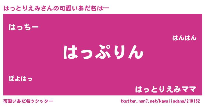 | 男性向けラノベタイトル風あだ名 | 『はっとりえみ~年齢イコール彼女いない歴の魔法使い~』 |