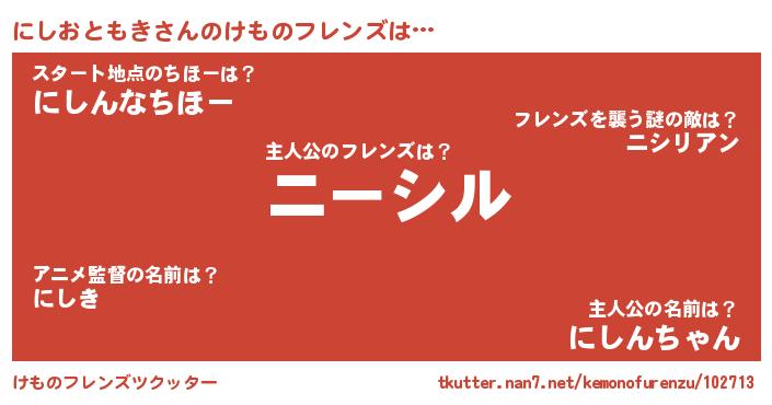 | 女子向けラノベタイトル風あだ名 | 『異世界で失敗しない100のにしおともき』 |