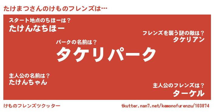 | 男性向けラノベタイトル風あだ名 | 『Re:たけまつから始める異世界生活』 |
