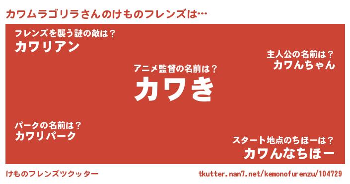 | 萌えアニメ | 主人公(カワムラゴリラ)のあだ名『 カワさん』 |