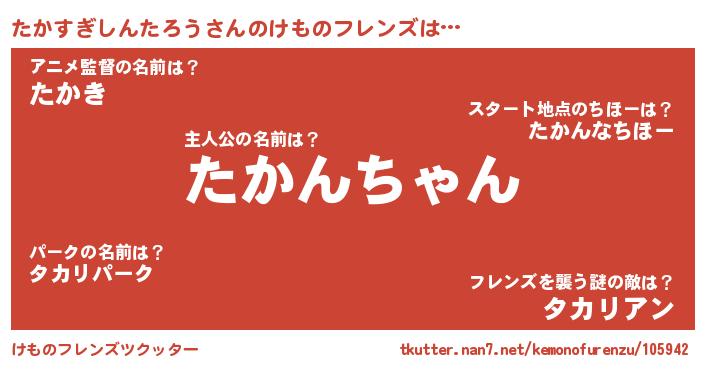| 男性向けラノベタイトル風あだ名 | 『うちのたかすぎしんたろうが世界を掌握している!』 |