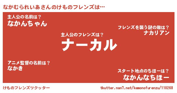 | 意味不明あだ名 | 『住所不定無職なかむられいあ(53歳)』 |