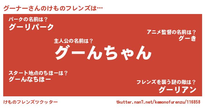 | 男性向けラノベタイトル風あだ名 | 『グーナーの憂鬱』『緋弾のグーナー』 |