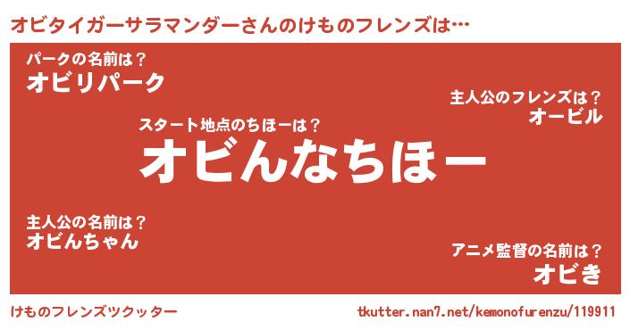 | 男性向けラノベタイトル風あだ名 | 『オビタイガーサラマンダーに滅ぼされるだけの簡単なお仕事です』 |