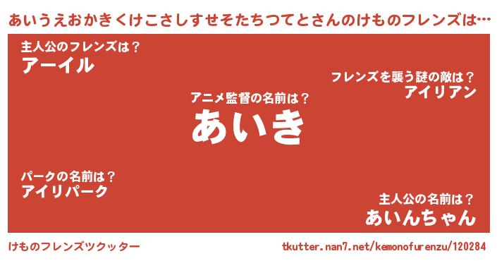 | 萌えアニメ | 主人公(あいうえおかきくけこさしすせそたちつてと)のあだ名『 あいあいきゅん』 |