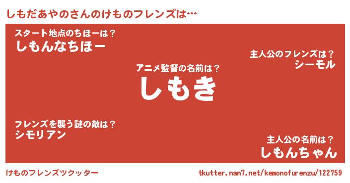 | ポケモン風あだ名 | 『シモキング』『ヒシモダアヤノ』 |