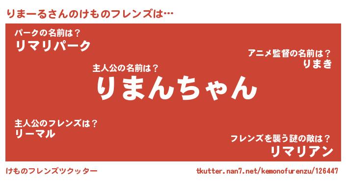 | 男性向けラノベタイトル風あだ名 | 『りまーるの憂鬱』『リマールスレイヤー』 |