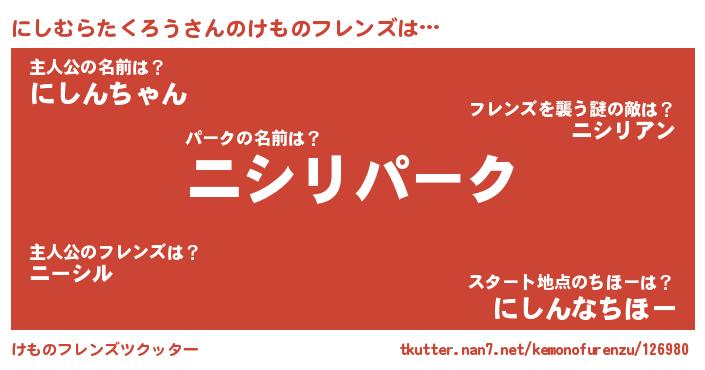 | 肩書あだ名 | 『にしむらたくろう閣下』 |