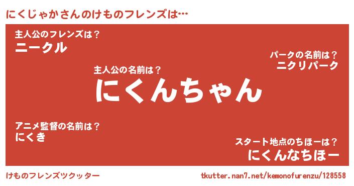 | 男性向けラノベタイトル風あだ名 | 『転生したらにくじゃかだった件』 |