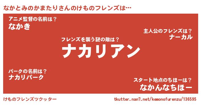 | 男性向けラノベタイトル風あだ名 | 『おまえをオタクにしてやるから、俺をなかとみのかまたりにしてくれ! 』 |