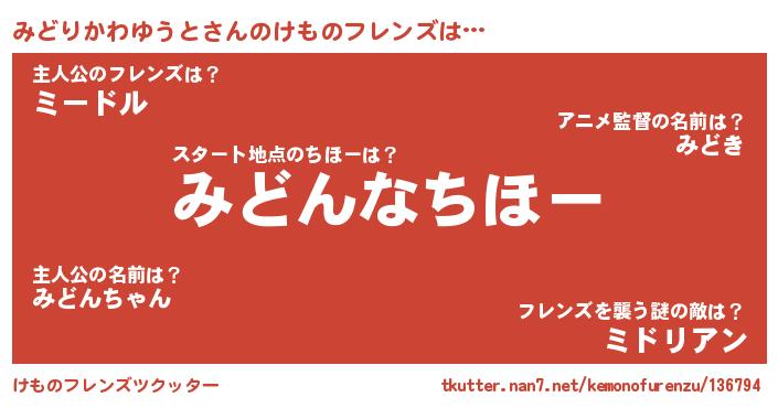| 男性向けラノベタイトル風あだ名 | 『みどりかわゆうとに滅ぼされるだけの簡単なお仕事です』 |