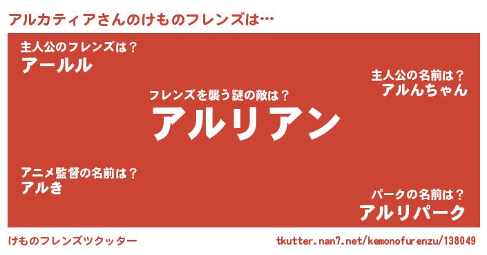 | 意味不明あだ名 | 『住所不定無職アルカティア(71歳)』 |