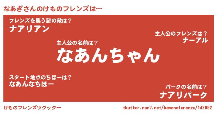 | 男性向けラノベタイトル風あだ名 | 『なあぎの憂鬱』『魔弾の王となあぎ』 |