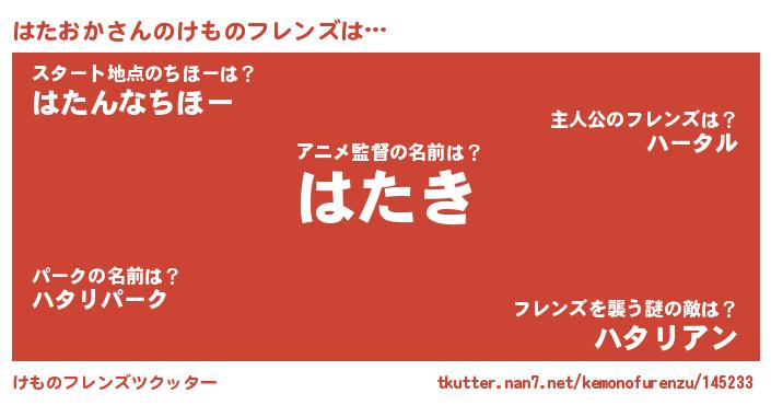 | 2回繰り返すあだ名 | 『ゆらゆら』『いらいら』『ははたた』 |