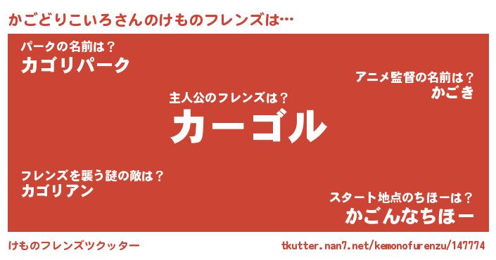 | 男性向けラノベタイトル風あだ名 | 『かごどりこいろ~年齢イコール彼女いない歴の魔法使い~』 |
