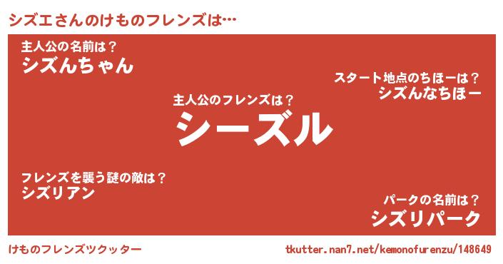 | 意味不明あだ名 | 『永久保存シズエ』『つくし科シズエ属』 |