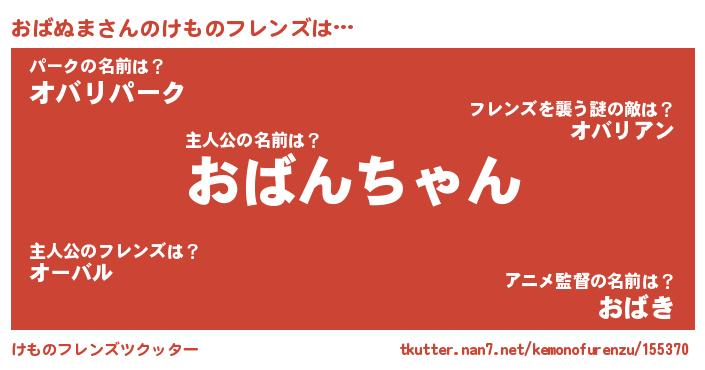 | 男性向けラノベタイトル風あだ名 | 『この素晴らしい世界におばぬまを!』 |