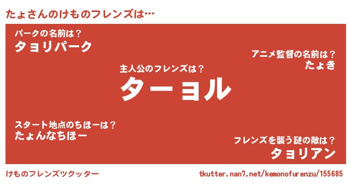 | 男性向けラノベタイトル風あだ名 | 『魔弾の王とたょ』 |