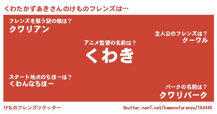 | ヒーロー風カッコイイあだ名 | 『幻影騎士クワ』『ネオクワタカズアキ』 |