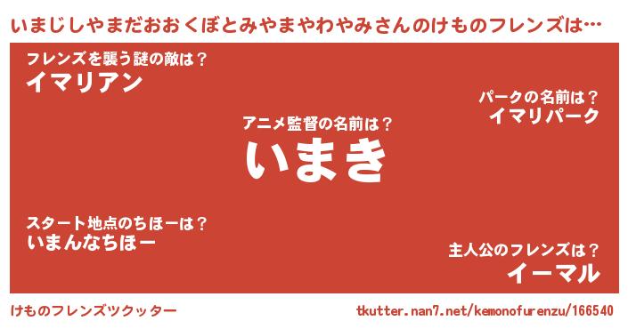 | 萌えアニメ | 物語のオチ『いまじしやまだおおくぼとみやまやわやみさんがボートに乗っていなくなる』 |