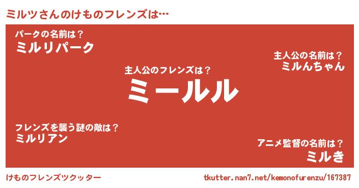 | 意味不明あだ名 | 『永久保存ミルツ』『自称ミルツ』 |