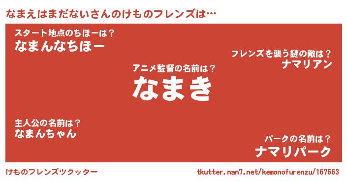 | ヒーロー風カッコイイあだ名 | 『天弓騎士ナマ』『仮面ナマダー』 |