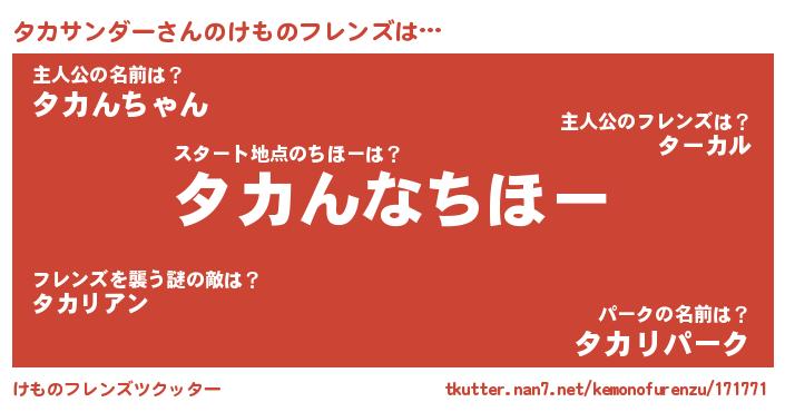 | 男性向けラノベタイトル風あだ名 | 『タカサンダー~年齢イコール彼女いない歴の魔法使い~』 |