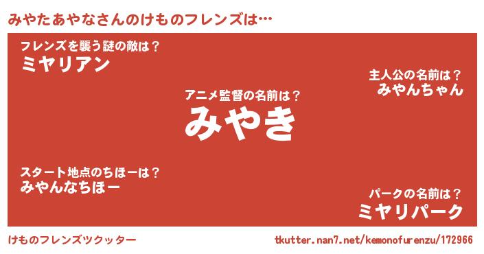 | ヒーロー風カッコイイあだ名 | 『天弓騎士ミヤ』『スーパーミヤタアヤナ』 |