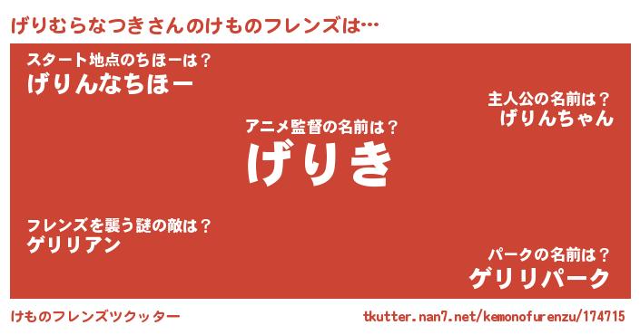 | ピコ太郎風あだ名 | 『ゲリ史郎』『ピゲ八郎』『ゲコ二郎』 |