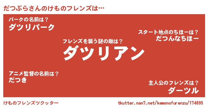 | 男性向けラノベタイトル風あだ名 | 『だつぷらに滅ぼされるだけの簡単なお仕事です』 |