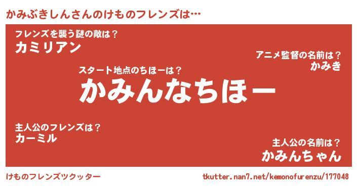 | 男性向けラノベタイトル風あだ名 | 『うちのかみぶきしんが世界を掌握している!』 |