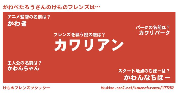 | 男性向けラノベタイトル風あだ名 | 『魔弾の王とかわべたろう』 |
