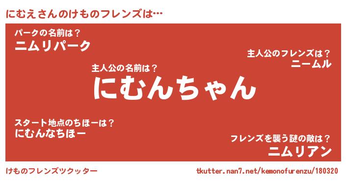 | 料理風あだ名 | 『にむえごはん』『栗とにむえのマフィン』 |
