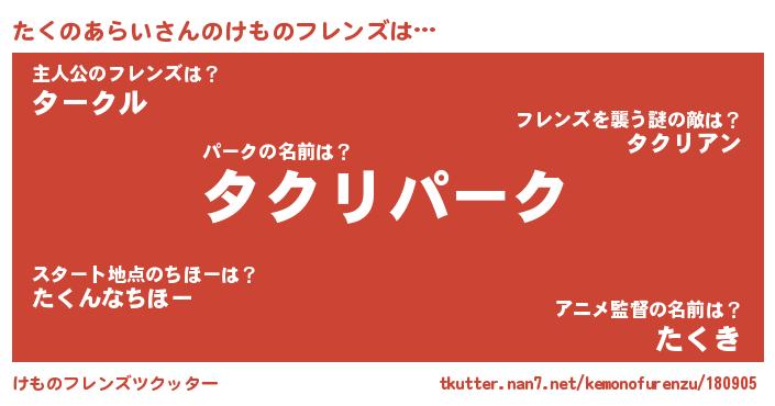 | ピコ太郎風あだ名 | 『ピコタ郎』『タク四郎』『タタ太郎』 |