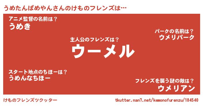 | ヒーロー風カッコイイあだ名 | 『ネオウメタンバメヤン』『炎刃騎士ウメ』 |