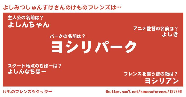| 男性向けラノベタイトル風あだ名 | 『この素晴らしい世界によしみつしゅんすけを!』 |