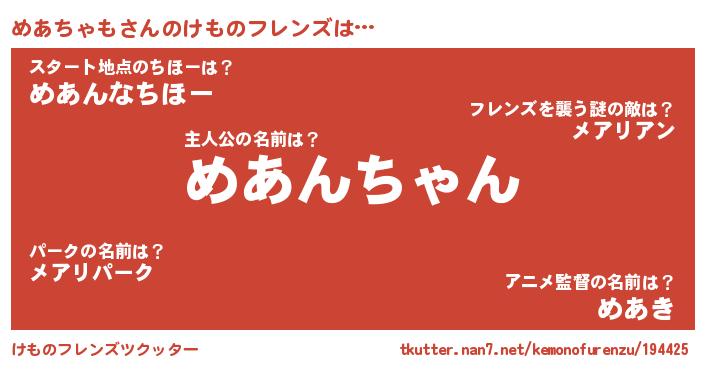 | 2回繰り返すあだ名 | 『めあめあ』『とろとろ』『めめああ』 |