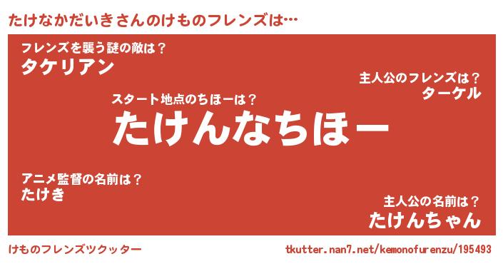 | 2回繰り返すあだ名 | 『たたけけ』『ぶかぶか』『たけたけ』 |