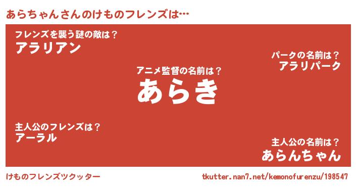 | ヒーロー風カッコイイあだ名 | 『幻影騎士アラ』『正義の使者あらちゃん』 |