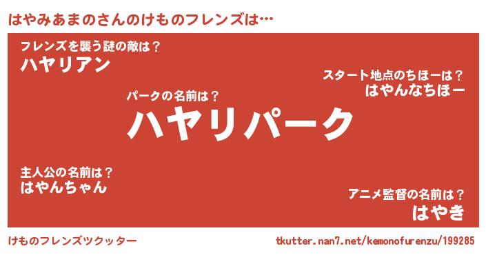 | 男性向けラノベタイトル風あだ名 | 『Re:はやみあまのから始める異世界生活』 |