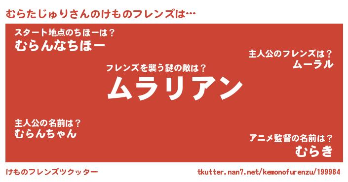 | 肩書あだ名 | 『むらたじゅり教授』『むらたじゅり団長』 |