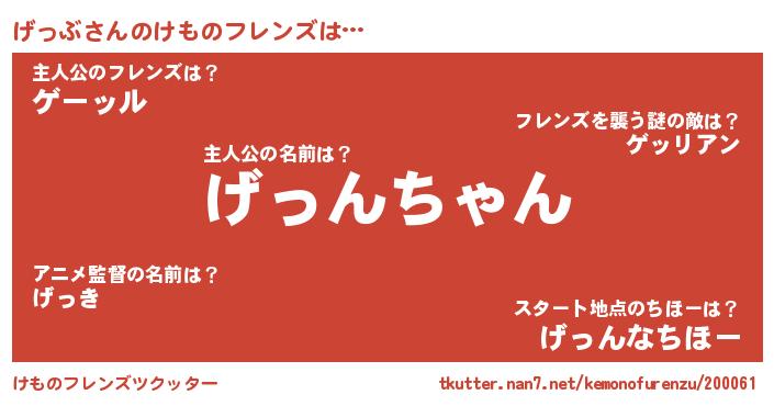| 2回繰り返すあだ名 | 『げっげっ』『きんきん』『げげっっ』 |