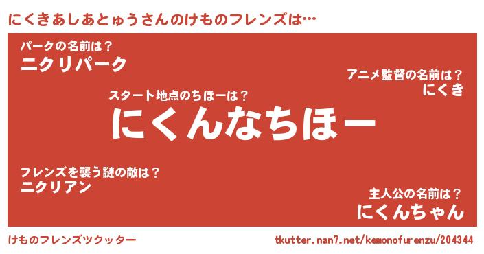 | 男性向けラノベタイトル風あだ名 | 『にくきあしあとゅうに滅ぼされるだけの簡単なお仕事です』 |