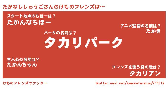| 肩書あだ名 | 『たかなししゅうご閣下』 |
