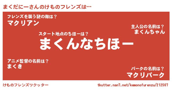 | 肩書あだ名 | 『まくだにー総理大臣』『まくだにー機長』 |